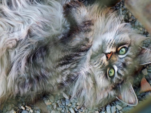 Wallpaper Fluffy gray cat with green eyes lies on small stones.