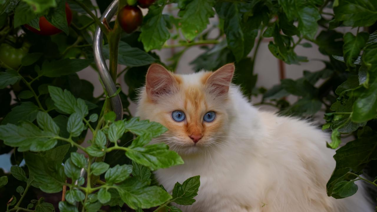 Wallpaper Fluffy thoroughbred blue-eyed cat sitting in tomatoes