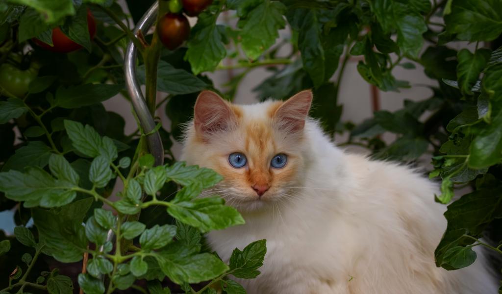 Wallpaper Fluffy thoroughbred blue-eyed cat sitting in tomatoes