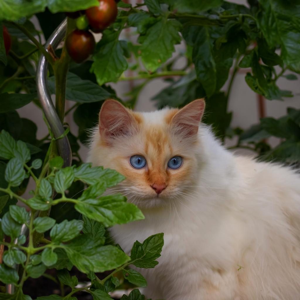 Wallpaper Fluffy thoroughbred blue-eyed cat sitting in tomatoes