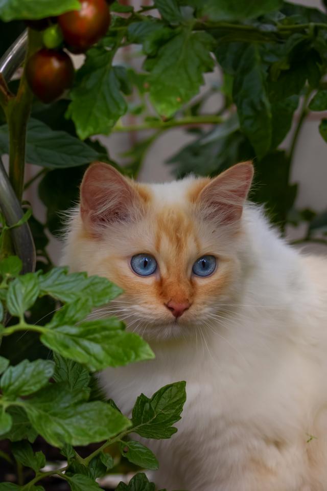 Wallpaper Fluffy thoroughbred blue-eyed cat sitting in tomatoes