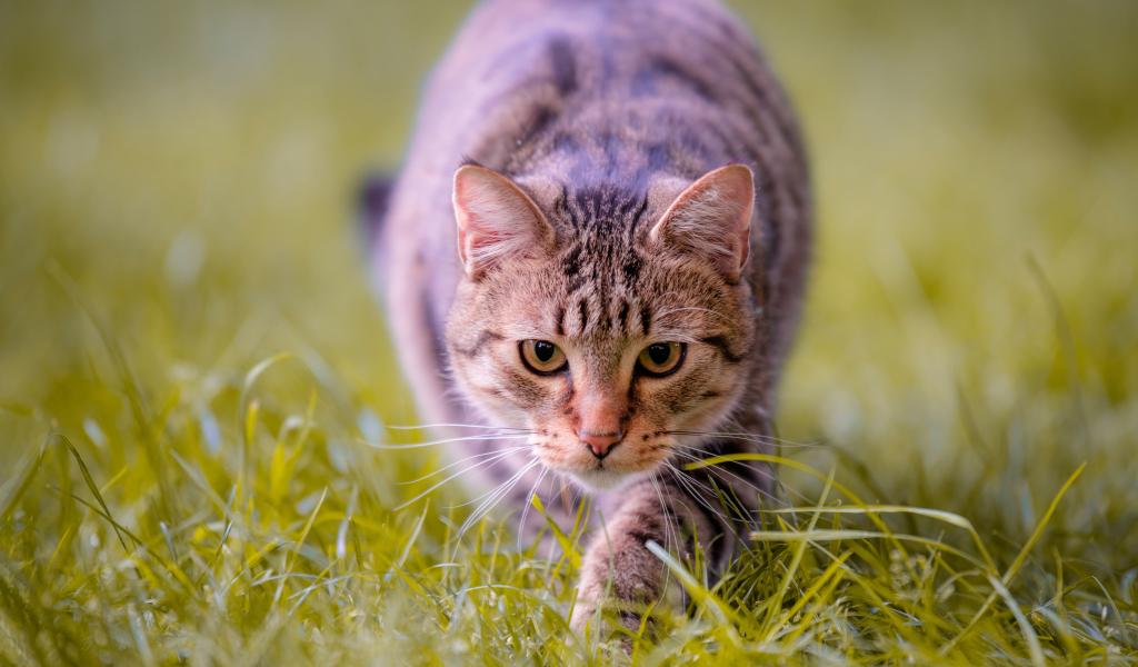 Wallpaper Big gray green-eyed cat lies on the green grass