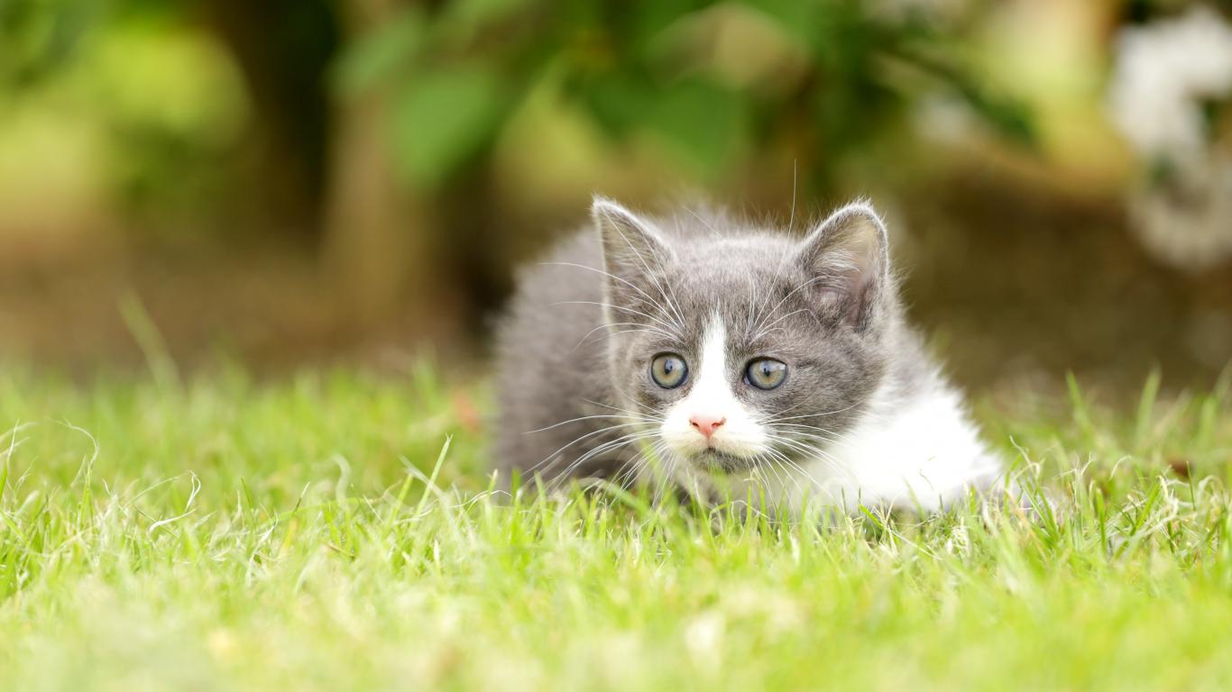 Wallpaper Little kitten lies on green grass.