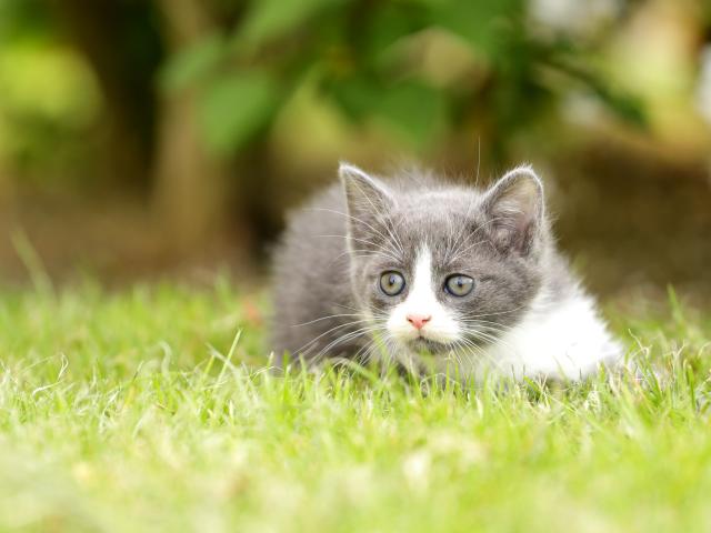 Wallpaper Little kitten lies on green grass.