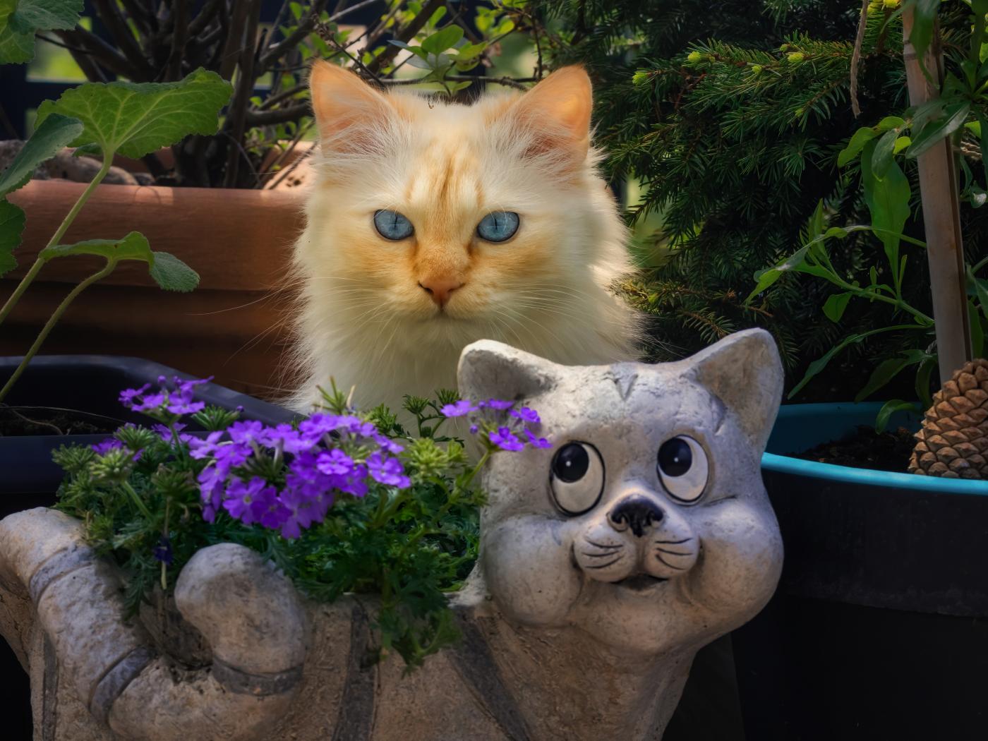 Wallpaper Blue-eyed red cat hiding behind a garden figure