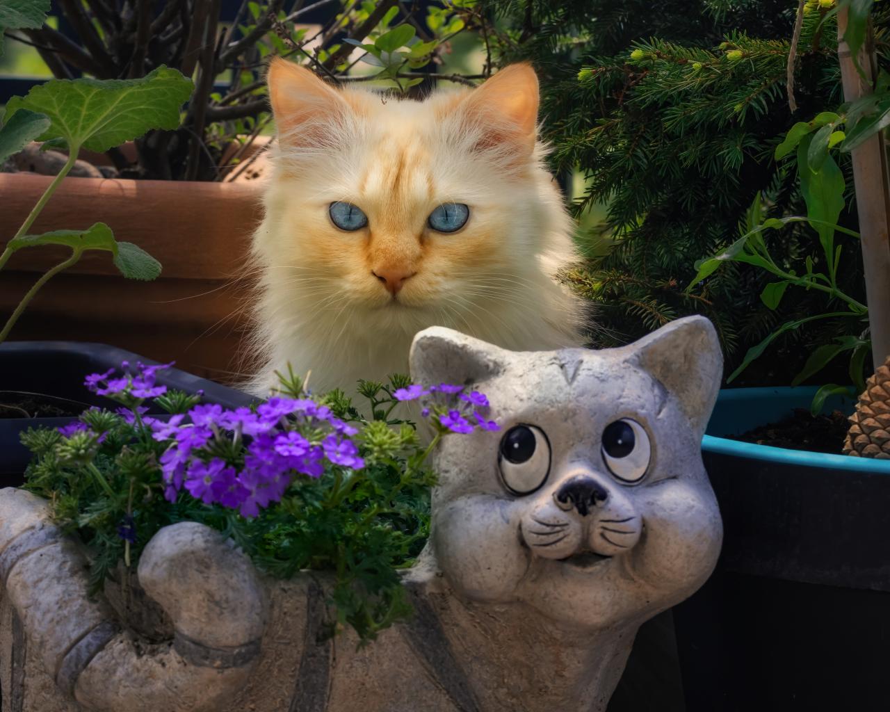 Wallpaper Blue-eyed red cat hiding behind a garden figure