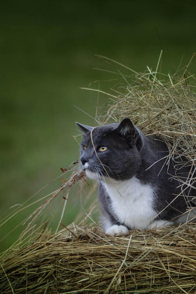 Wallpaper A cat sits in a pile of hay on the field
