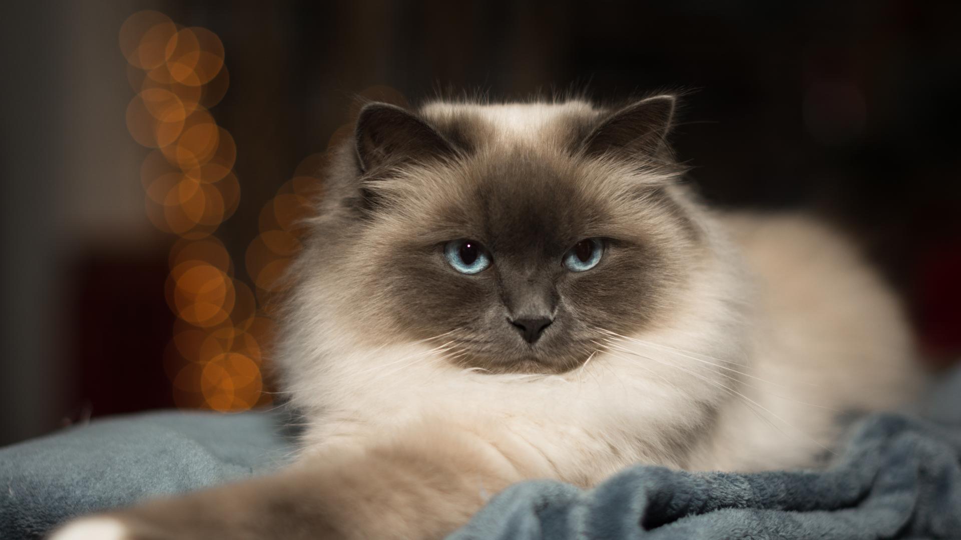 Wallpaper Purebred fluffy blue-eyed cat lies on the bed