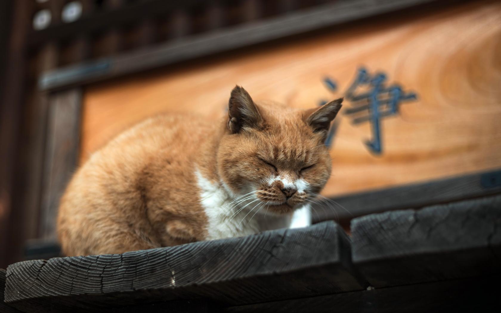 Wallpaper Dozing ginger cat on a wooden doorstep