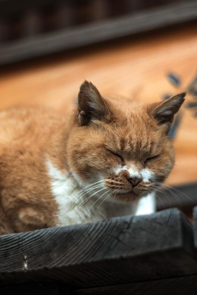 Wallpaper Dozing ginger cat on a wooden doorstep