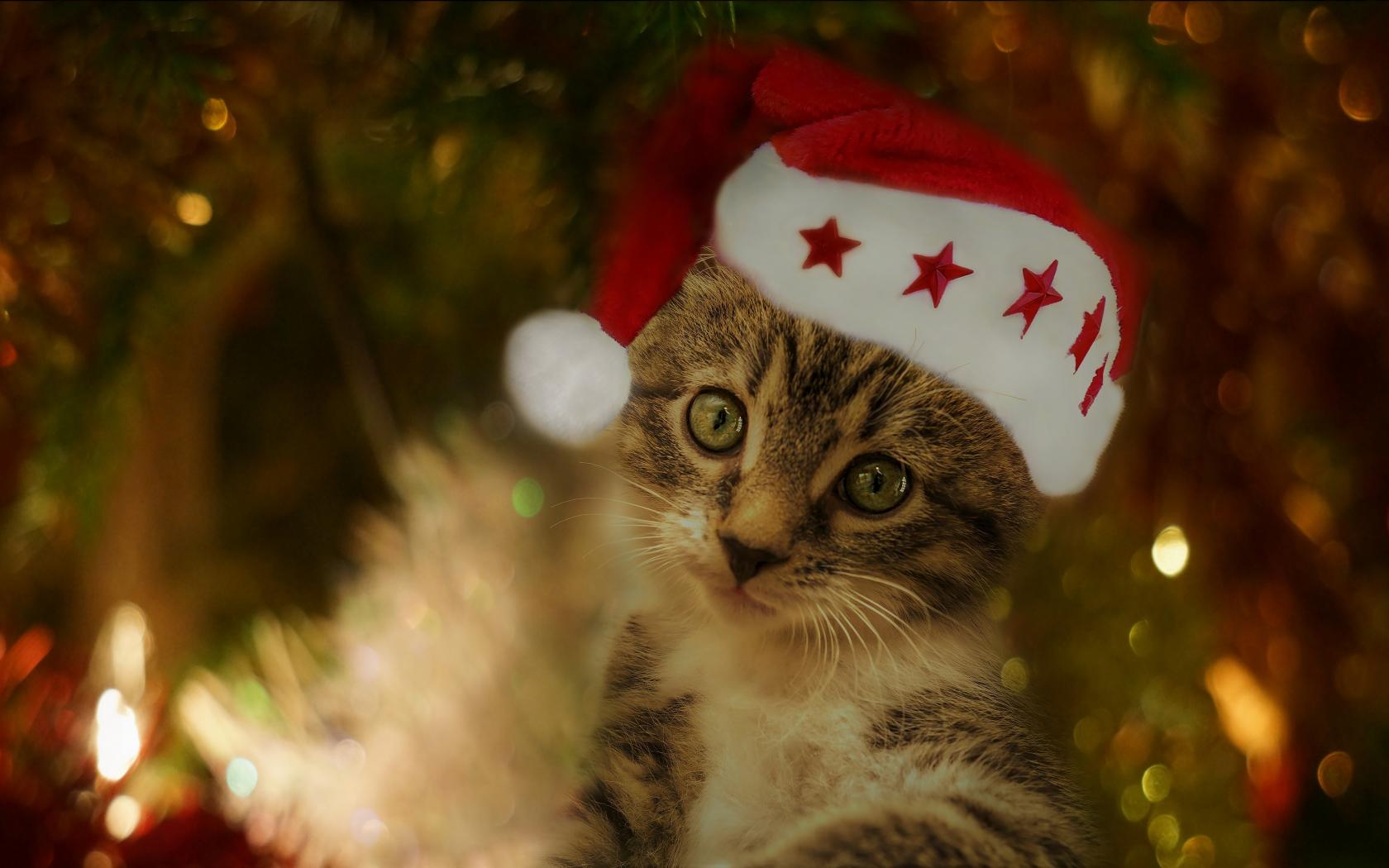 Wallpaper Funny gray kitten in a red hat under the Christmas tree