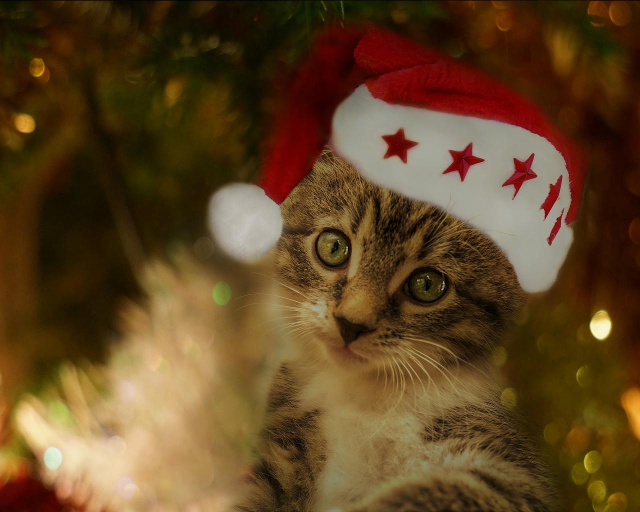 Wallpaper Funny gray kitten in a red hat under the Christmas tree