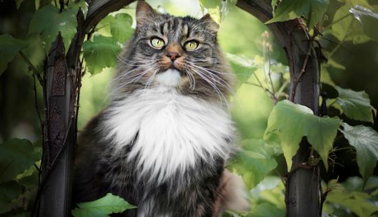 Wallpaper Fluffy gray and white cat in a thicket of grapes