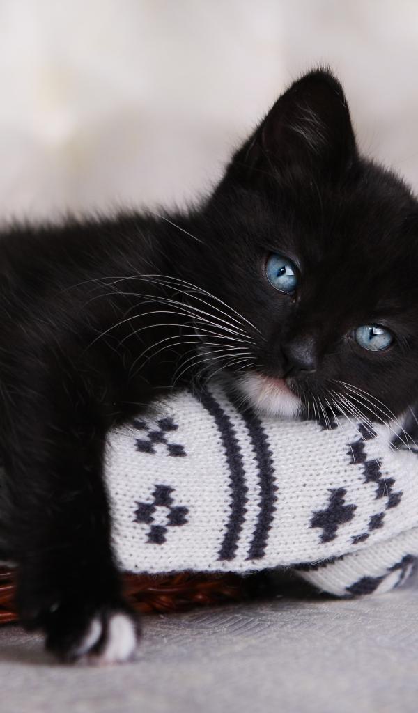Wallpaper Little black kitten lies in a basket