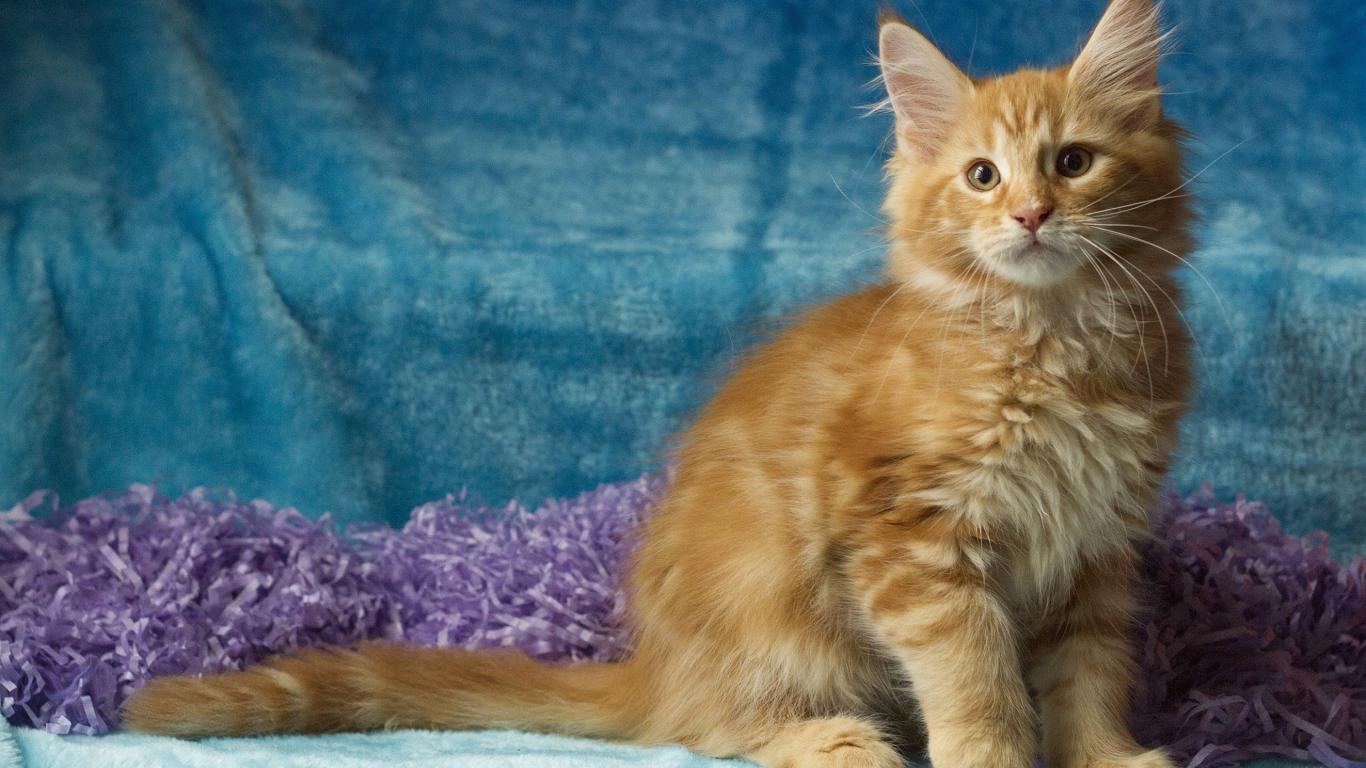 Wallpaper Fluffy red Maine Coon kitten on a blue background