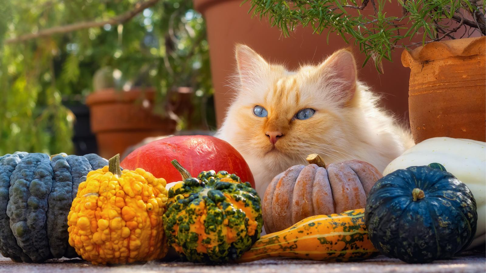 Wallpaper Red-haired blue-eyed cat with pumpkins
