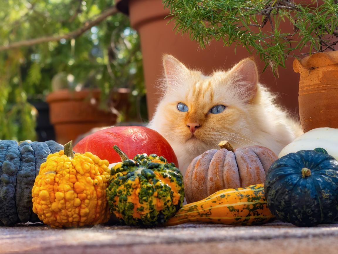 Wallpaper Red-haired blue-eyed cat with pumpkins
