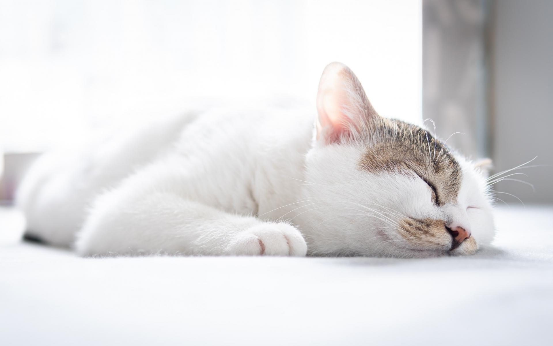 Wallpaper White domestic cat sleeping on the bed