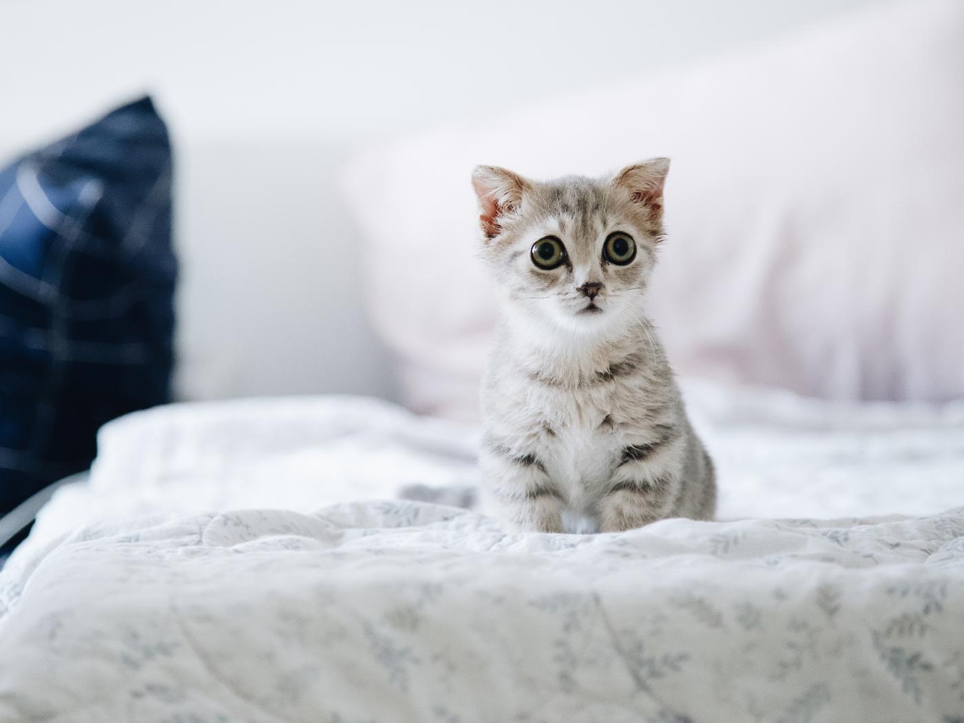 Wallpaper Little scared kitten sitting on the bed