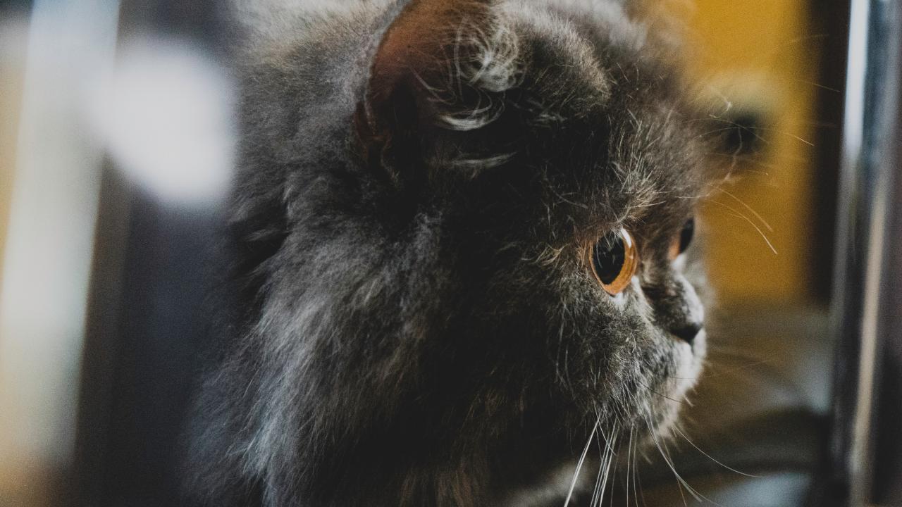 Wallpaper Fluffy gray cat with yellow eyes looks up