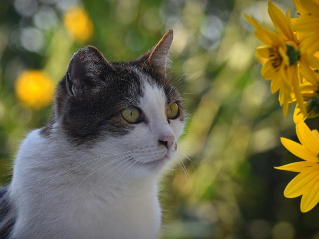 Wallpaper Cat sitting by yellow flowers