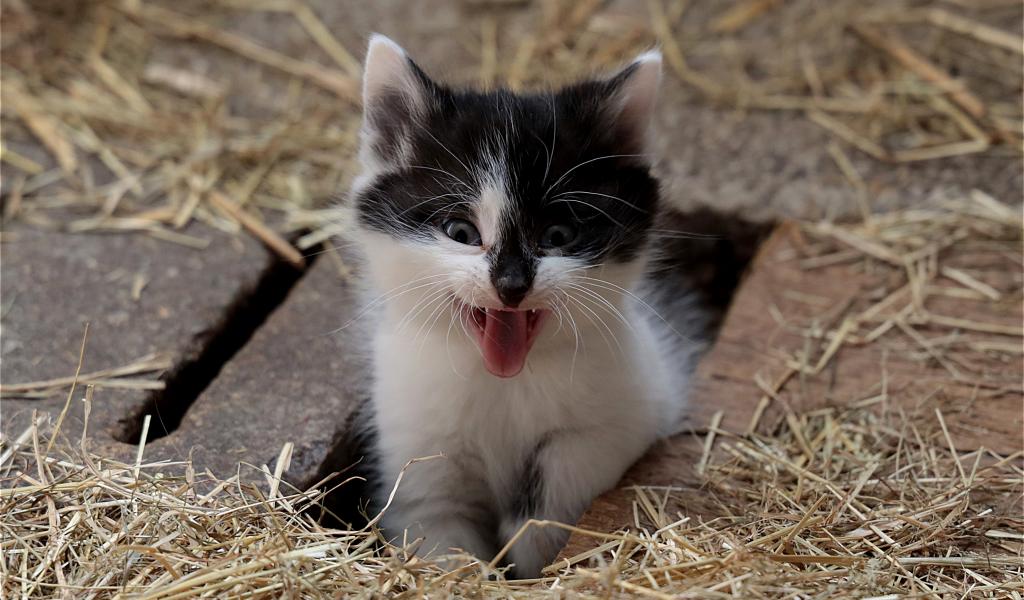 Wallpaper Little funny black and white kitten yawns
