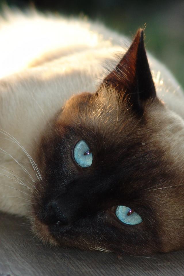 Wallpaper Beautiful blue-eyed Siamese cat lies on a bench