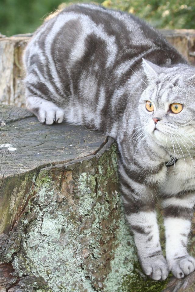 Wallpaper British striped cat sitting on a tree stump