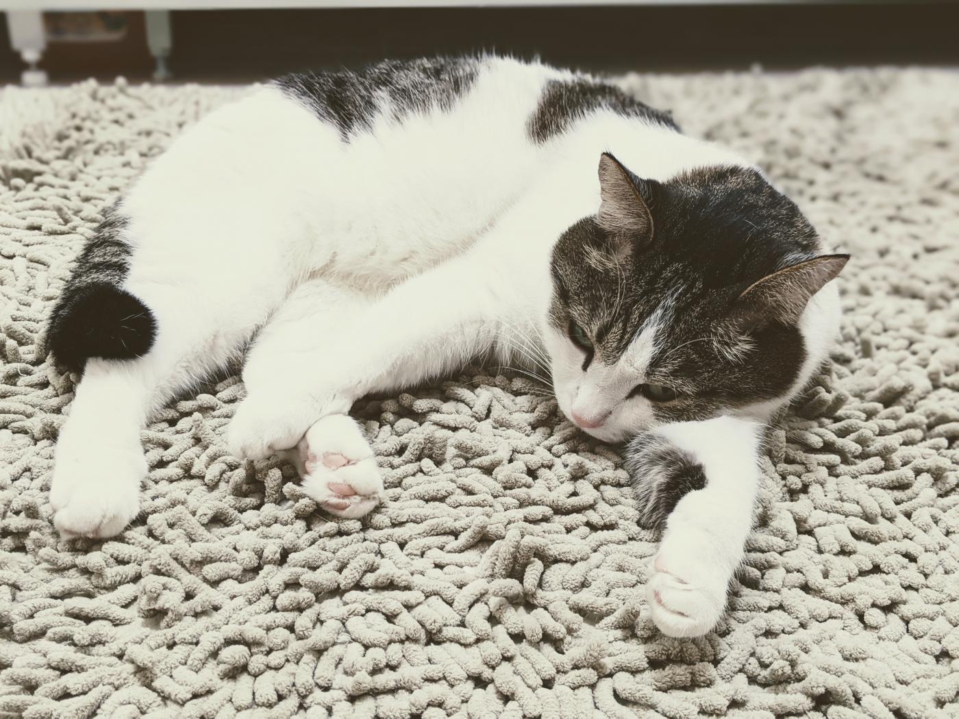 » Wallpaper Domestic cat lies on the bedspread