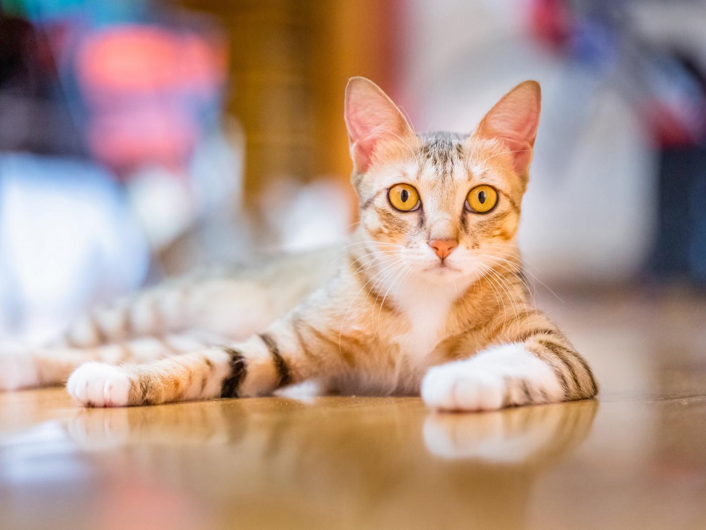 Wallpaper Domestic cat with yellow eyes lies on the floor