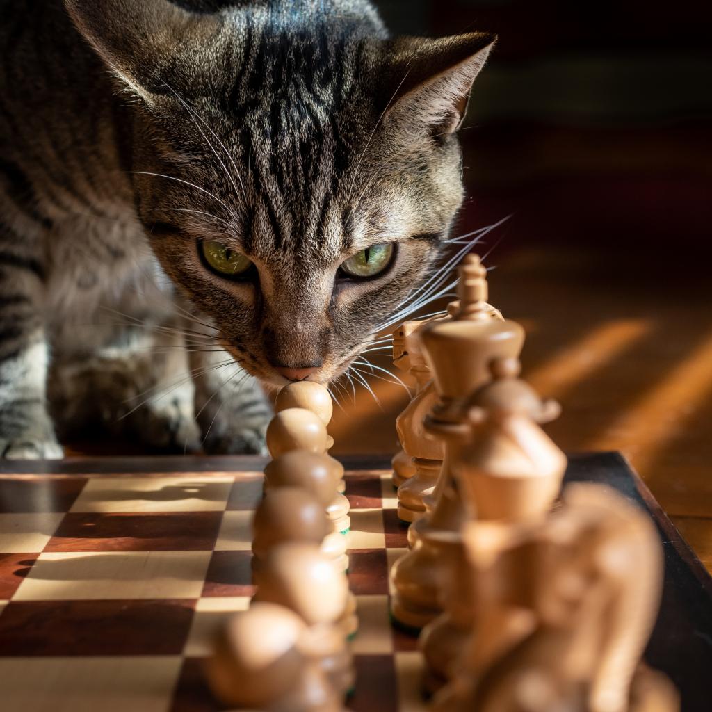 Wallpaper Gray cat sniffing chess