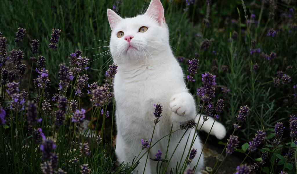Wallpaper Beautiful white cat sitting in lavender flowers