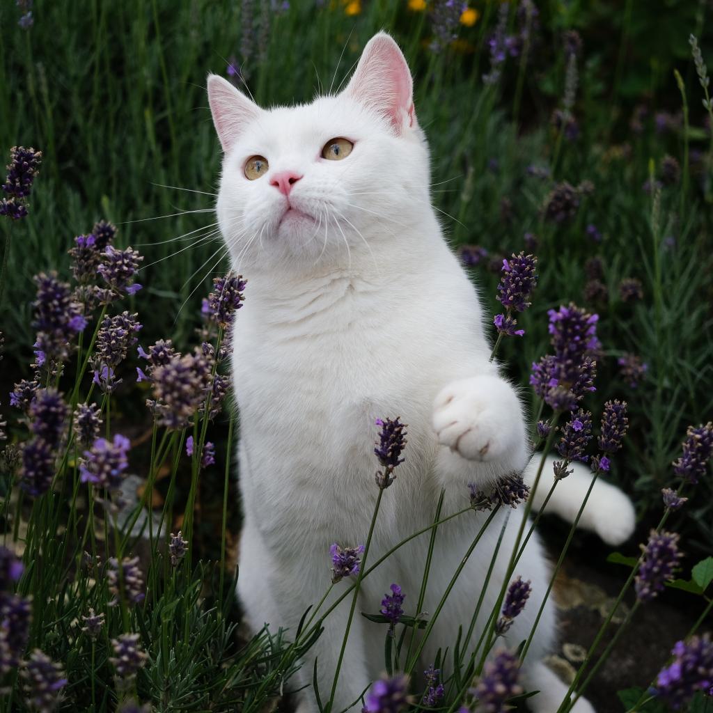 Wallpaper Beautiful white cat sitting in lavender flowers