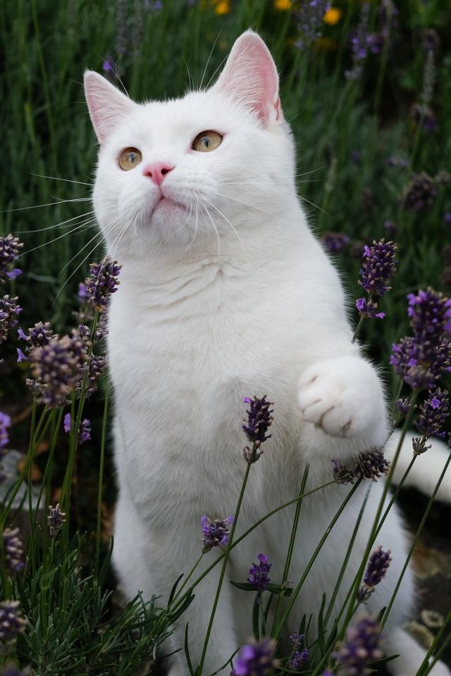 Wallpaper Beautiful white cat sitting in lavender flowers