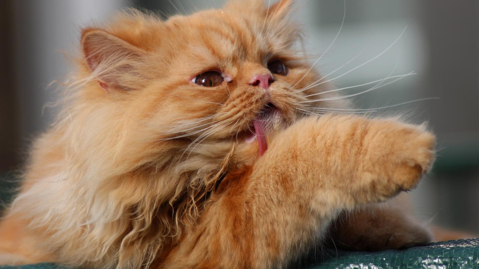 Wallpaper Fluffy red Persian cat licks paw
