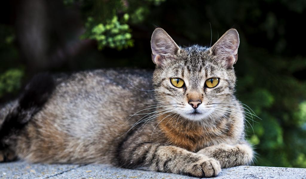 Wallpaper Beautiful gray cat with yellow eyes lies on the street