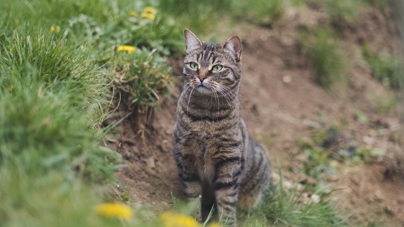 Wallpaper Gray tabby cat hunts in green grass