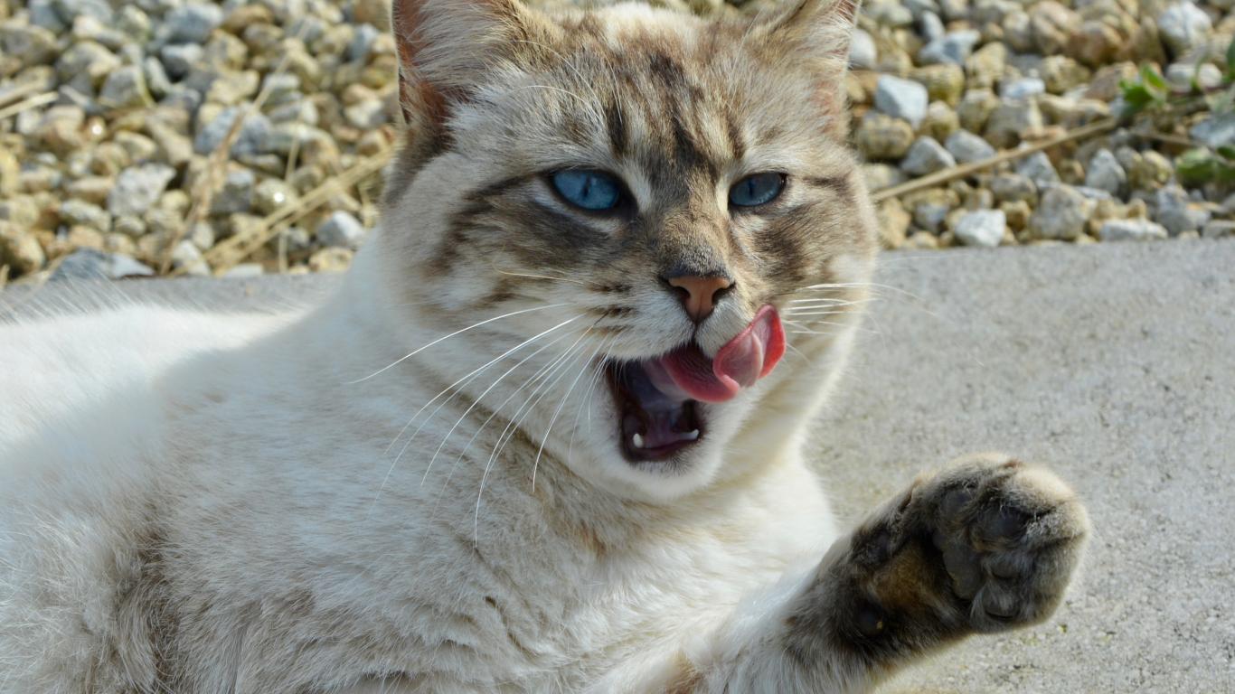 » Wallpaper Beautiful blue-eyed cat licks its lips