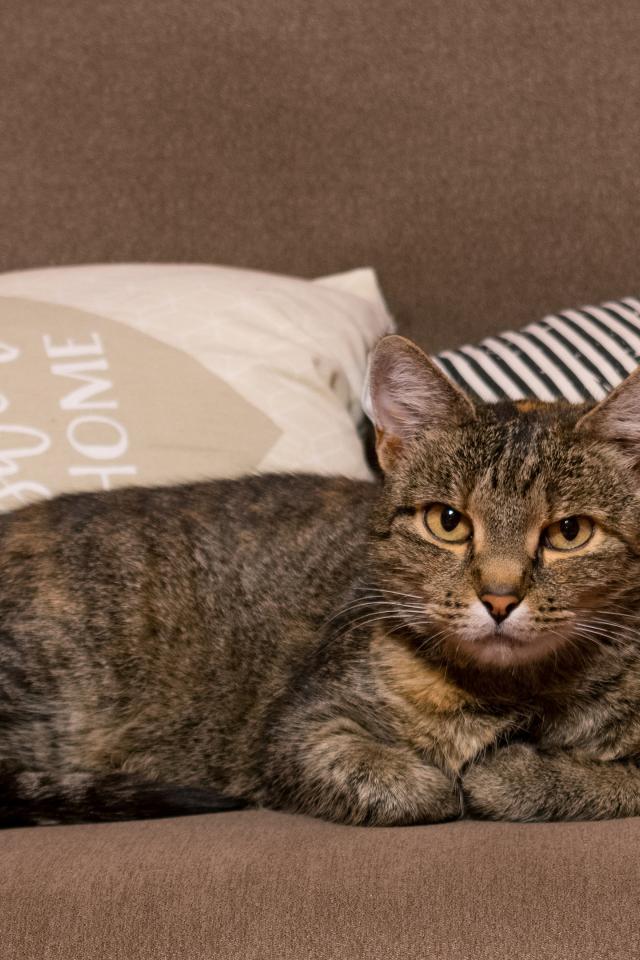 Wallpaper Serious gray domestic cat lies on the sofa
