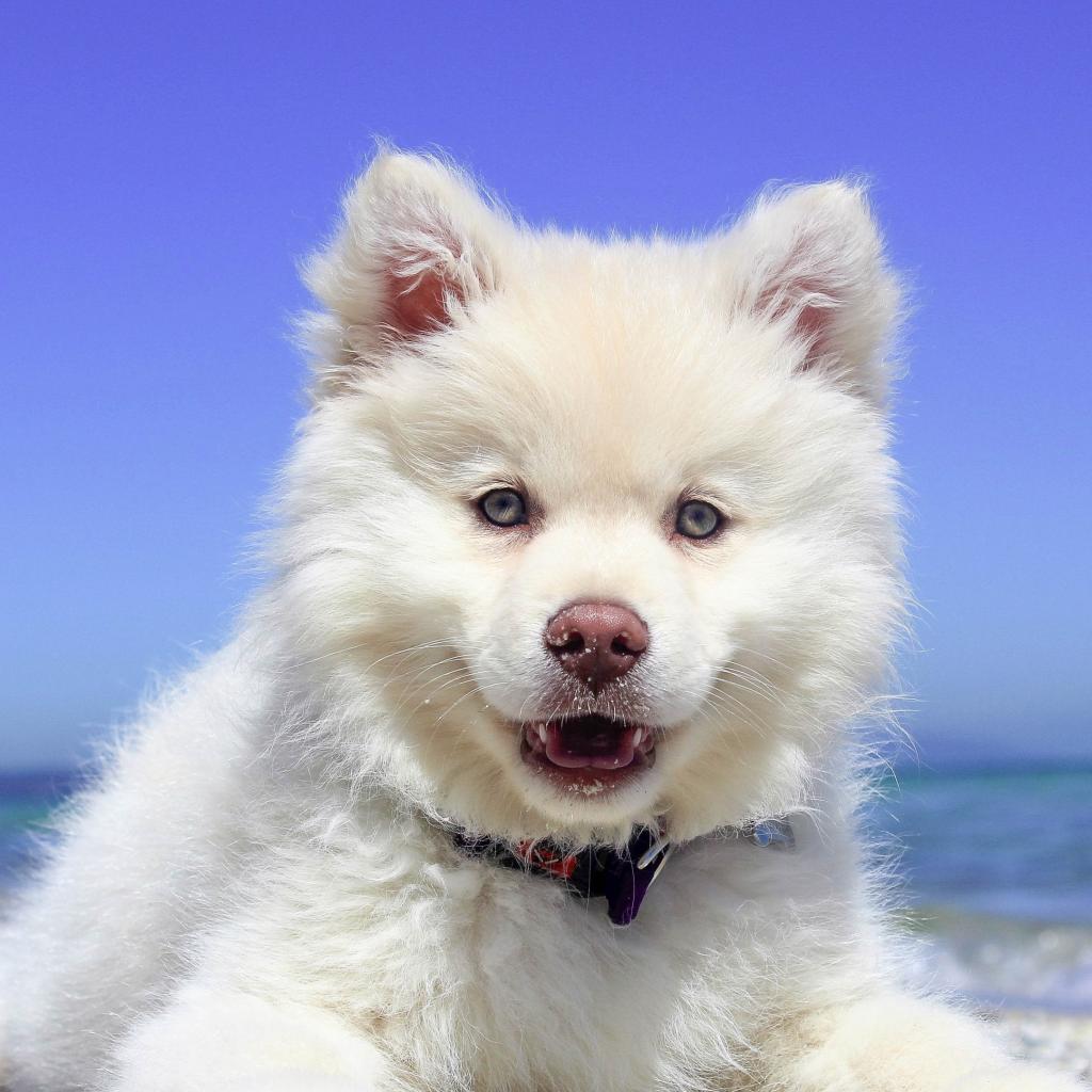 Wallpaper White fluffy puppy with a pink nose on the beach