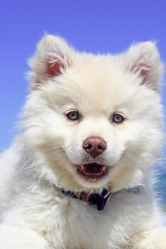 Wallpaper White fluffy puppy with a pink nose on the beach