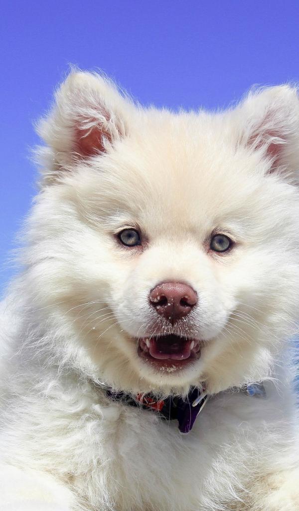 Wallpaper White fluffy puppy with a pink nose on the beach
