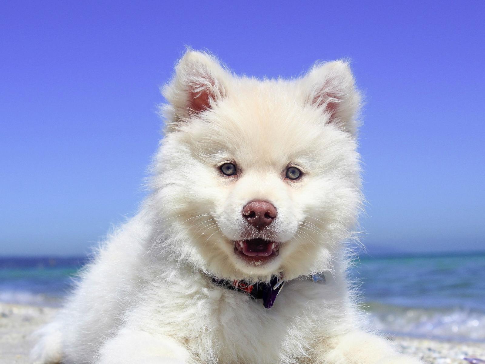 Wallpaper White fluffy puppy with a pink nose on the beach