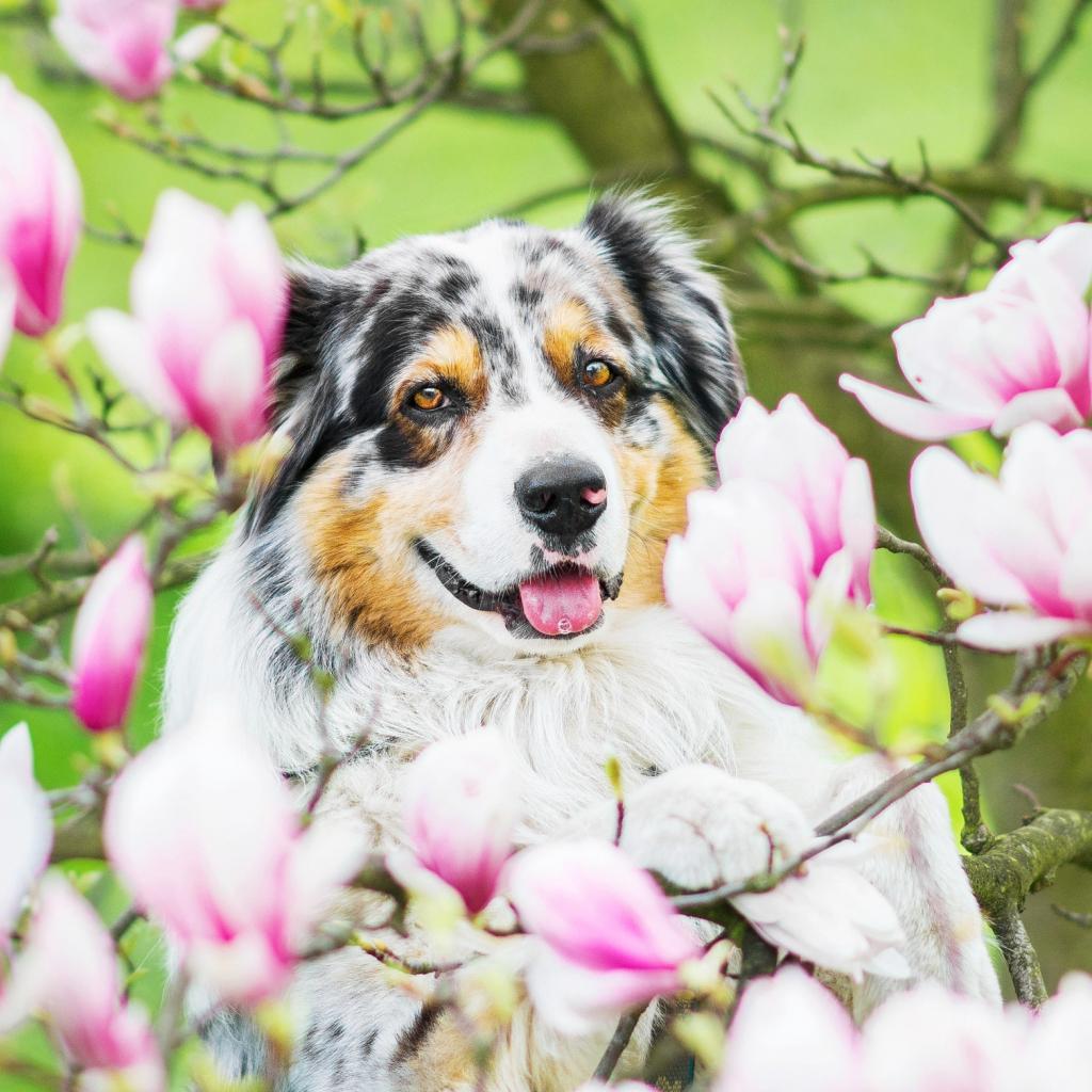 Wallpaper Australian Shepherd Dog in pink magnolia flowers