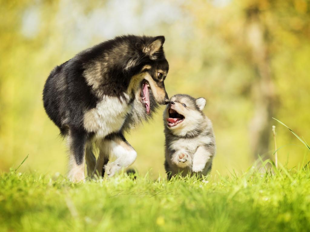 Wallpaper Gray big dog with a cheerful little puppy