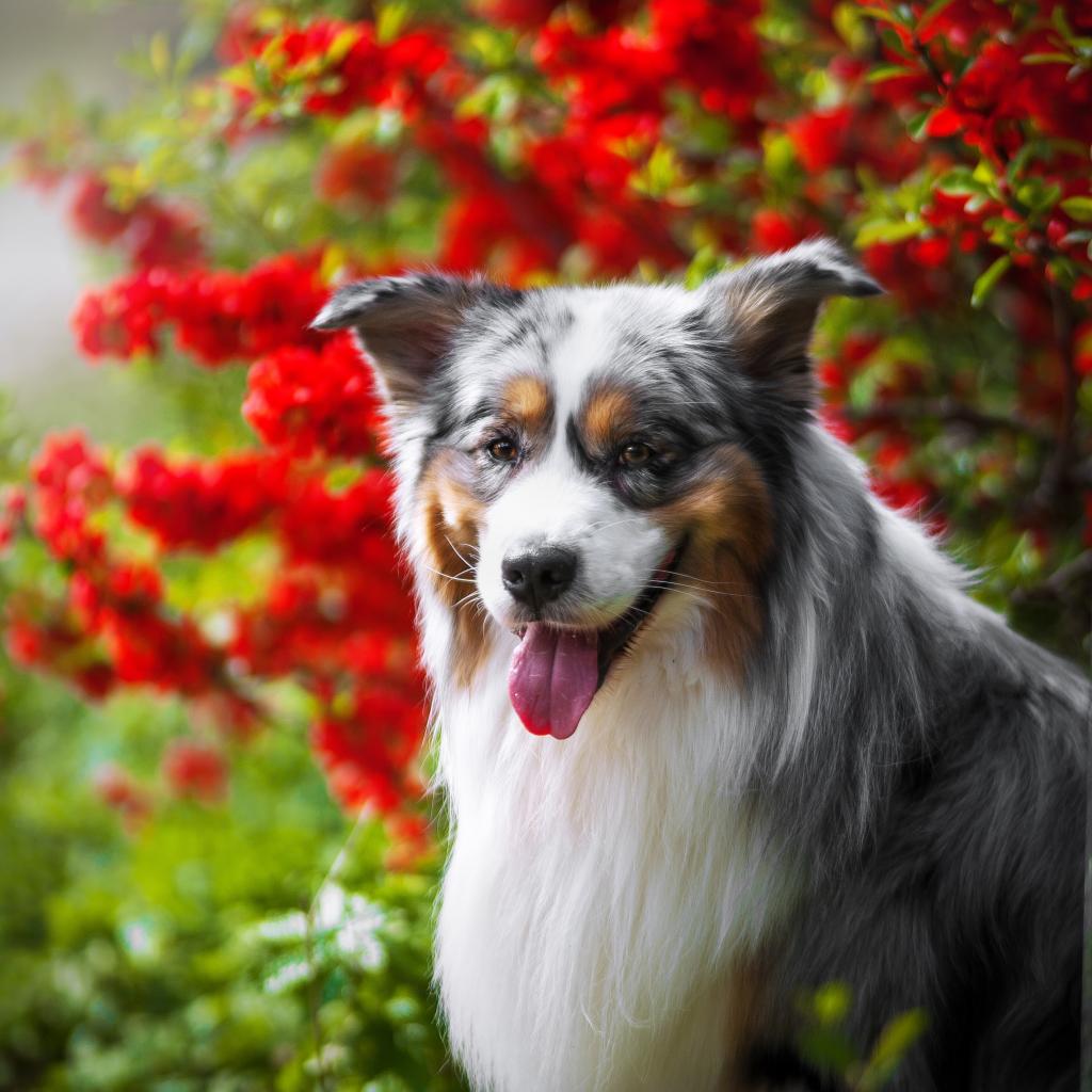 Wallpaper Australian Shepherd sits in ipomoea flowers