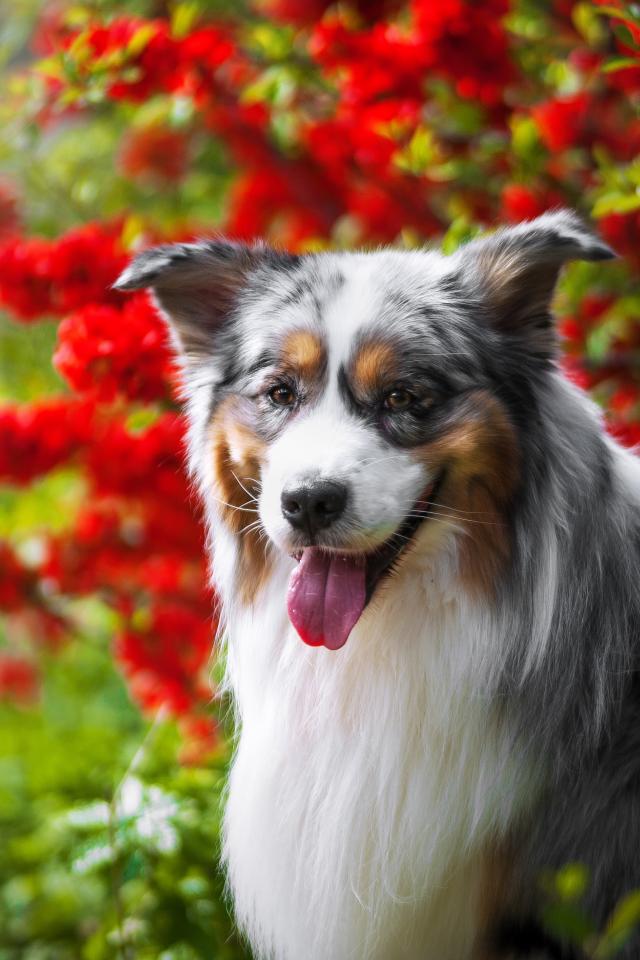Wallpaper Australian Shepherd in red flowers