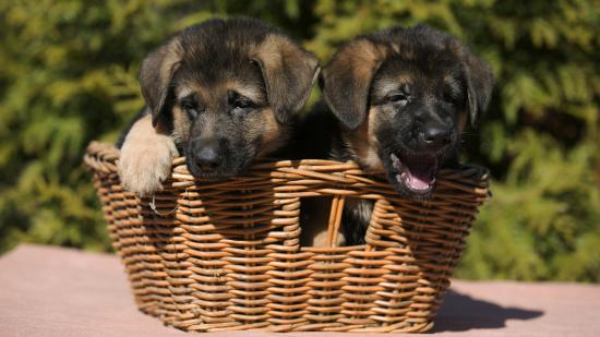 Wallpaper Two German Shepherd Puppies in a Wicker Basket