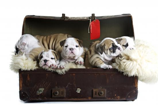 Wallpaper Big old suitcase with English bulldog puppies
