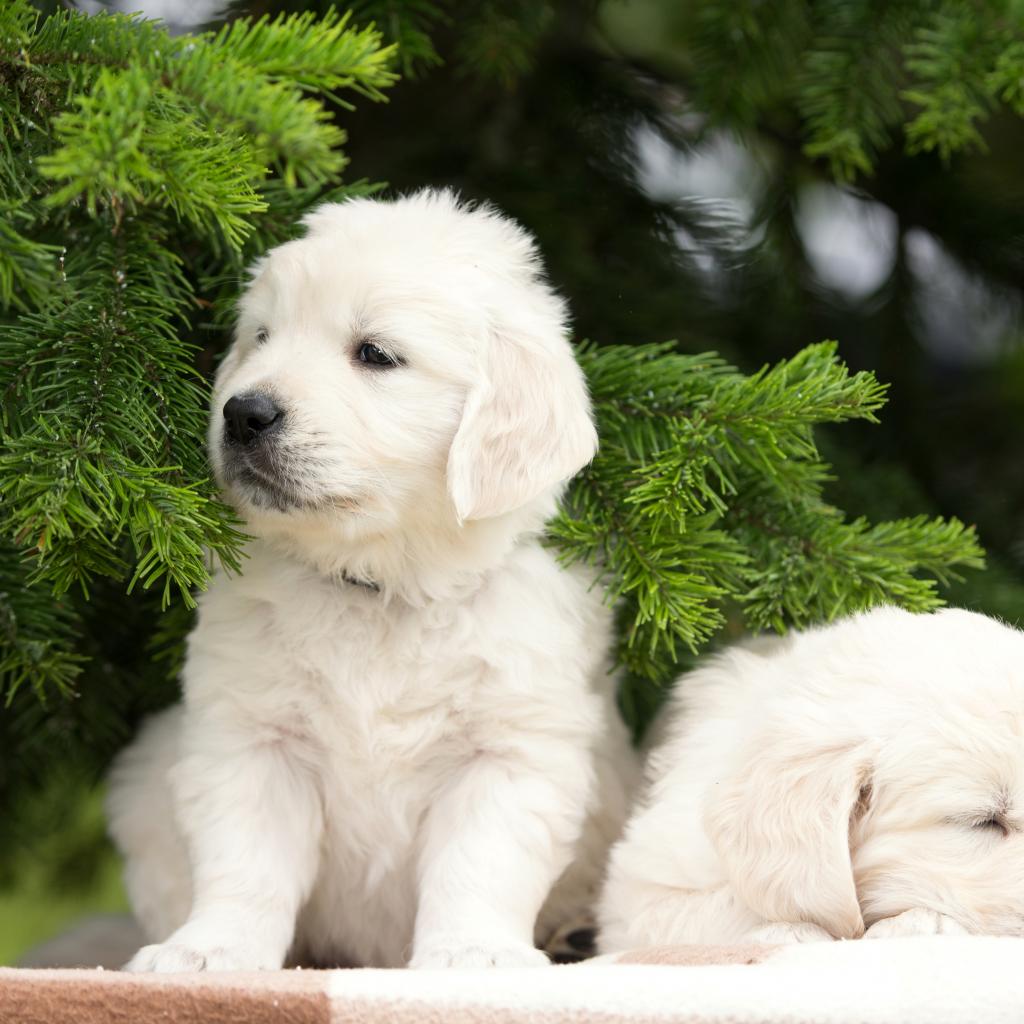 Wallpaper Two puppies of a golden retriever at a green spruce branch